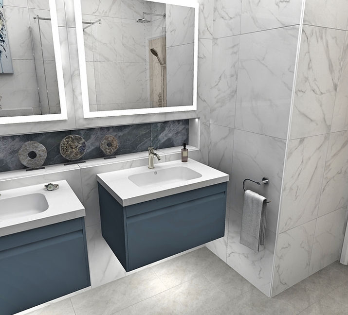 The double vanity area is a setting to bask in it's design. Intricate tiling and trim-work with the lit mirror cabinets set into our stud wall, give that flush, sleek look. The 1400mm double unit is an exquisite dark blue, with fluted drawer fronts to give a nod to the shower glass. Solid topper, two-tone basons and proud tall taps make these stations simply lovely to use.
